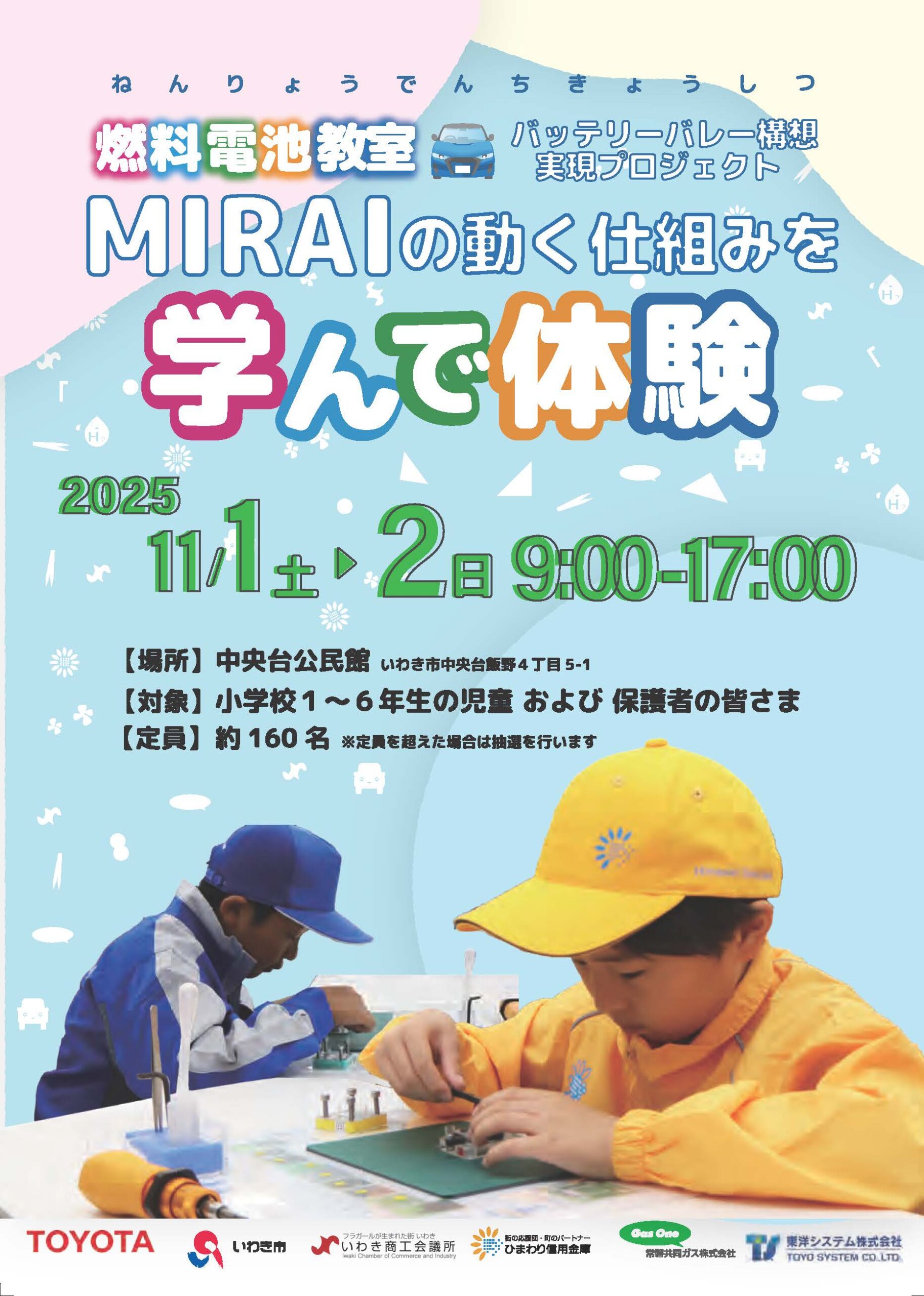 You are here: Home » Topics » 燃料電池教室開催燃料電池教室開催 Updated on 2025年9月29日 By @admin 燃料電池教室開催 はコメントを受け付けていません小学生向けモノづくり教室例年実施しております燃料電池教室を11月に実施します。9月に募集を締め切り、160名程度の小学生と保護者の方が参加する予定です。 2025年度いわきバッテリーバレー実現地域連携協議会事業これまでいわきバッテリーバレーフェスタ内でじっししておりましたが、今年度からはいわきバッテリーバレー実現地域連携協議会の主催で実施となります。いわきバッテリーバレー実現地域連携協議会についてTweet By @admin You May Also Like <中学生向け講座>2025年度「EVスクールin福島高専」の募集を開始しました いわきEVアカデミー2025 受講生募集を開始しました